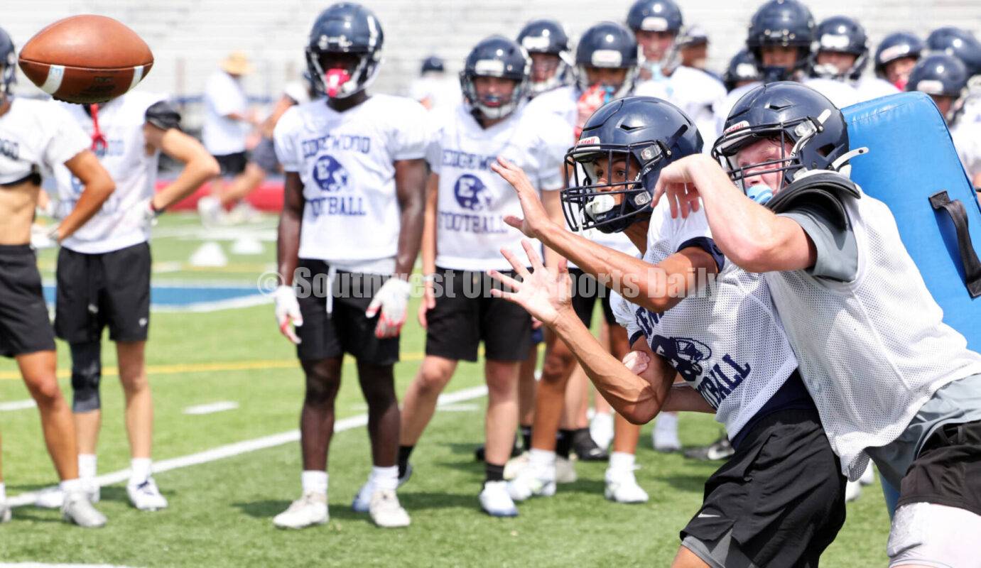 Edgewood High School players run through a drill July 17, 2025, during a football workout session at Kumler Field in St. Clair Township. RICK CASSANO/STAFF