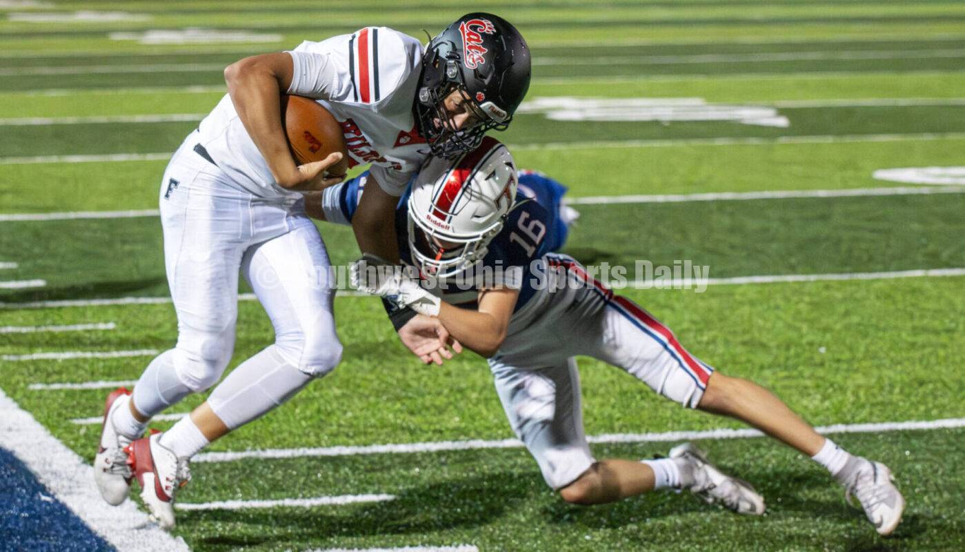 Franklin High School quarterback Ryan Michael gets knocked out of bounds by Talawanda's Kemper McAfee on Sept. 12, 2025, during a football game in Oxford. Host Talawanda won 35-10. MARTIN WHEELER/CONTRIBUTOR