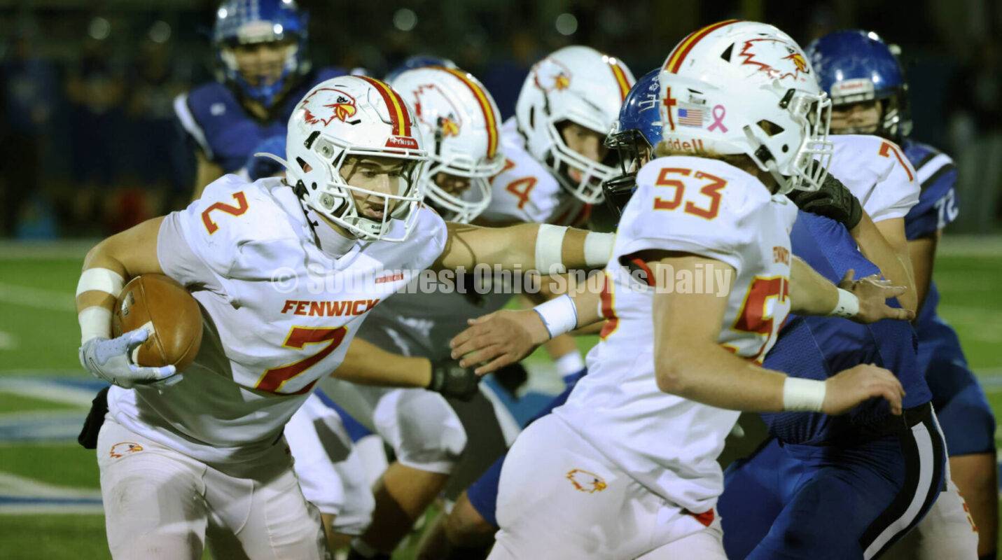 Fenwick High School's Jackson Kauffman (2) runs in a crowd Oct. 31, 2025, during a Division IV, Region 16 football playoff game at Brookville. The host Blue Devils won 30-12. RICK CASSANO/STAFF