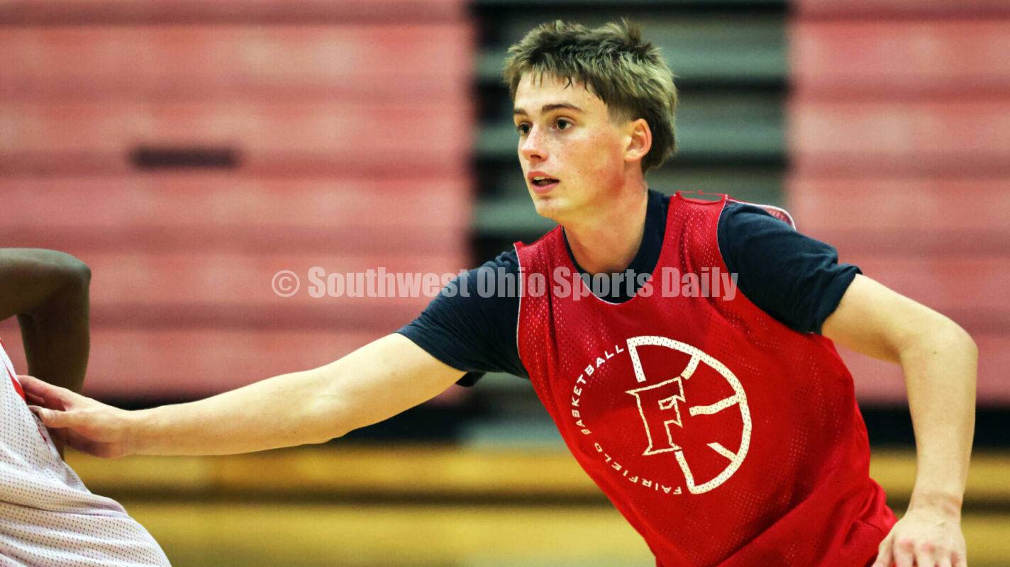 Fairfield High School's Riley Cunningham works defensively Nov. 17, 2025, during a boys basketball practice at the school in Fairfield. RICK CASSANO/STAFF