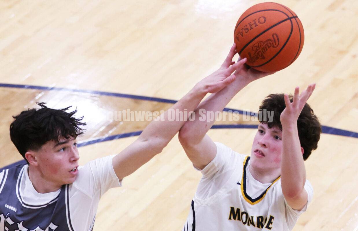Monroe High School's Colt Howard shoots over Edgewood's Gavin Cecere on Dec. 12, 2025, during a Southwestern Buckeye League Southwestern Division boys basketball game at Monroe. The host Hornets won 59-53. RON ALVEY/CONTRIBUTOR