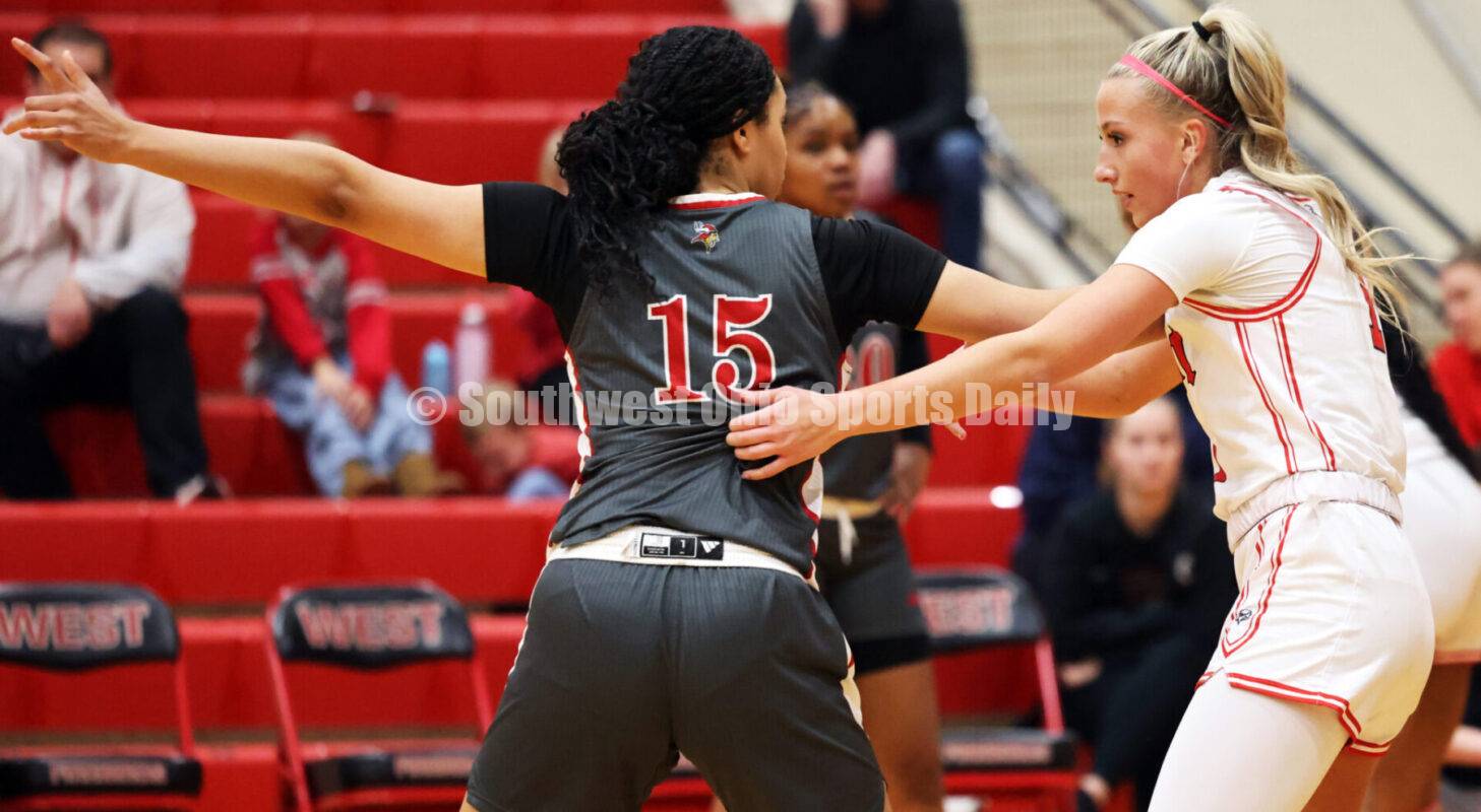 Lakota West High School's Katie Fox (right) defends Princeton's Simone Smith on Feb. 4, 2026, during a Greater Miami Conference girls basketball game at West. Princeton won 54-47. RICK CASSANO/STAFF