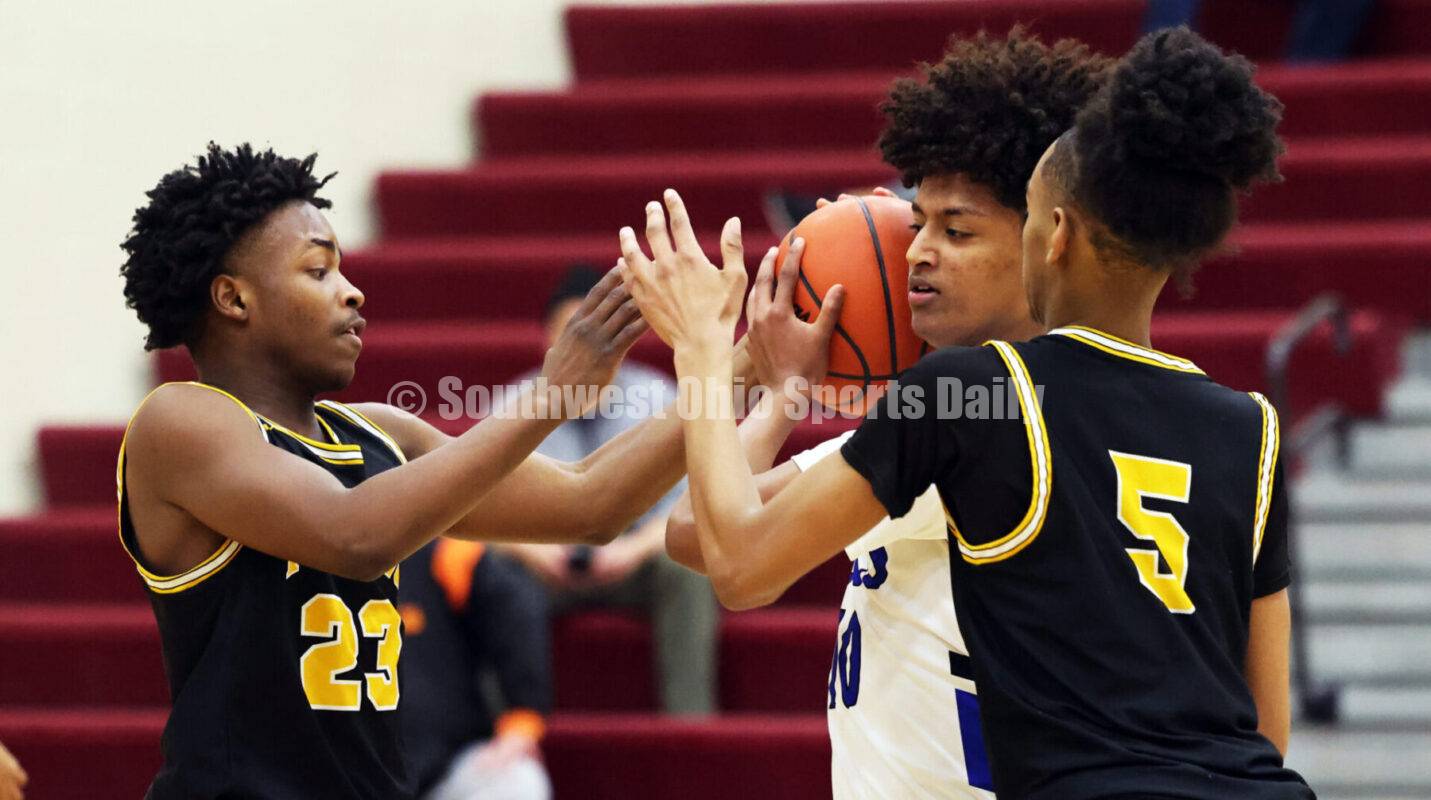 Cincinnati Christian School's Jonathan Maru is pressured by St. Bernard-Elmwood Place's D.J. Moss (23) and Taye Lewis-Hallums on Feb. 23, 2026, during a Division VI district boys basketball game at Ross. CCS won 64-54. RICK CASSANO/STAFF