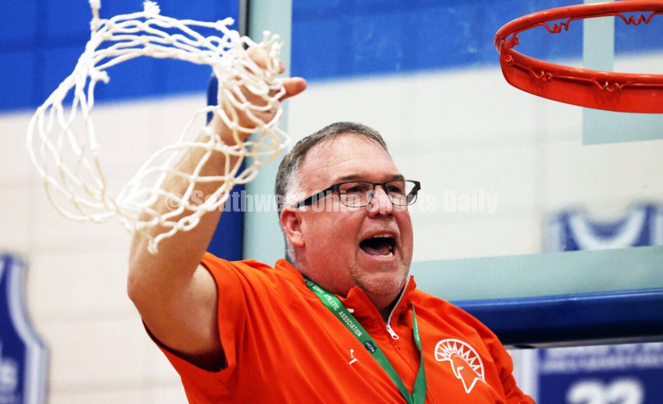 Waynesville High School coach Brandon Philpot celebrates March 7, 2026, after a Division V district boys basketball final against Arcanum at Xenia. Waynesville won 60-44. RICK CASSANO/STAFF