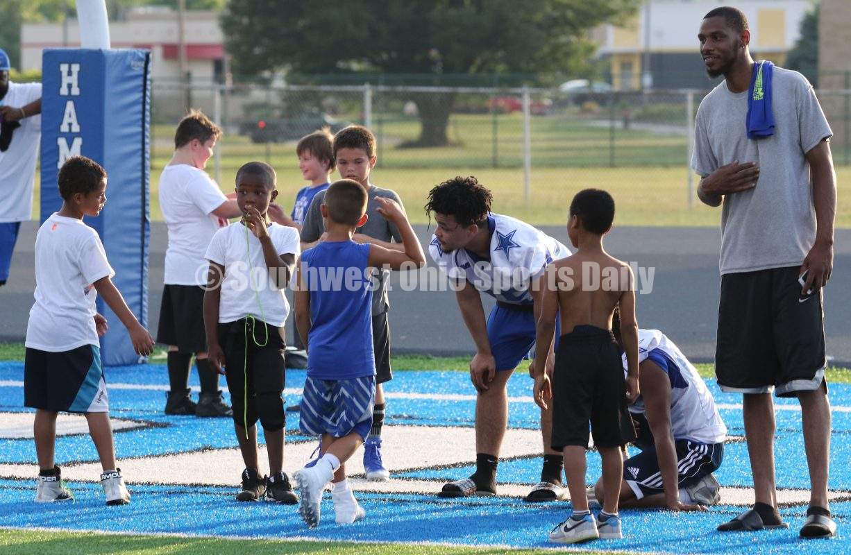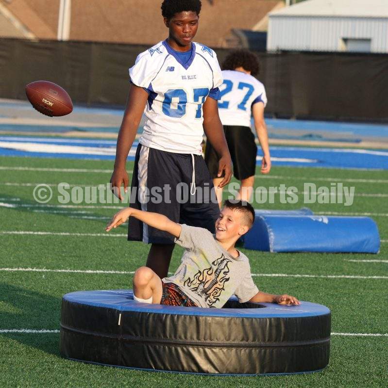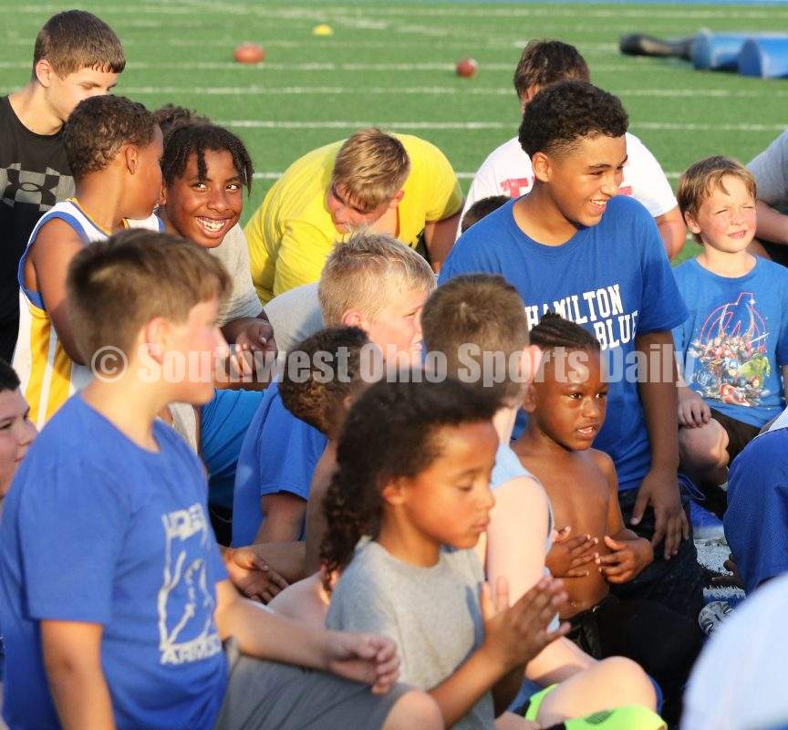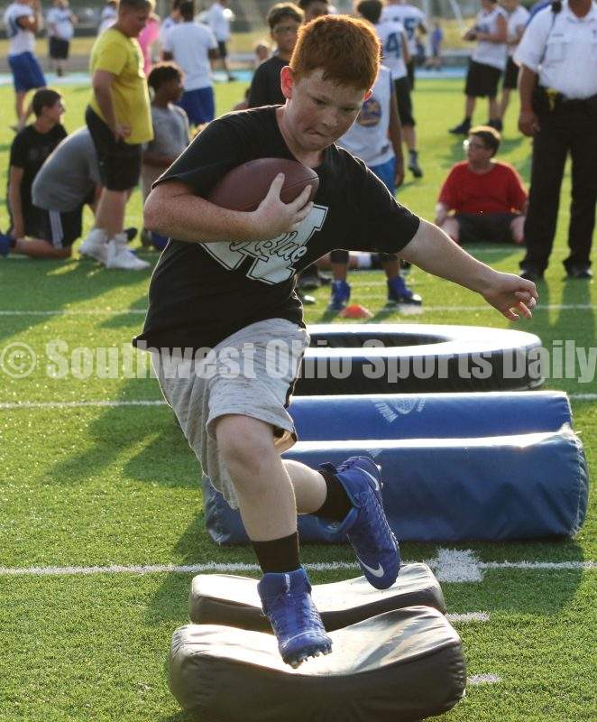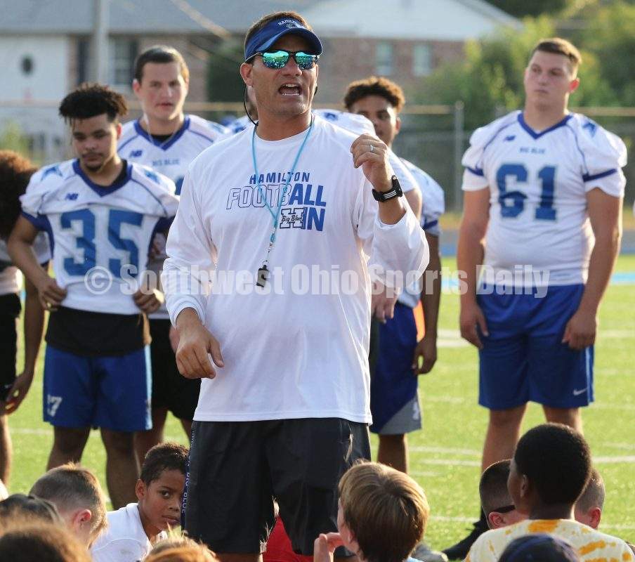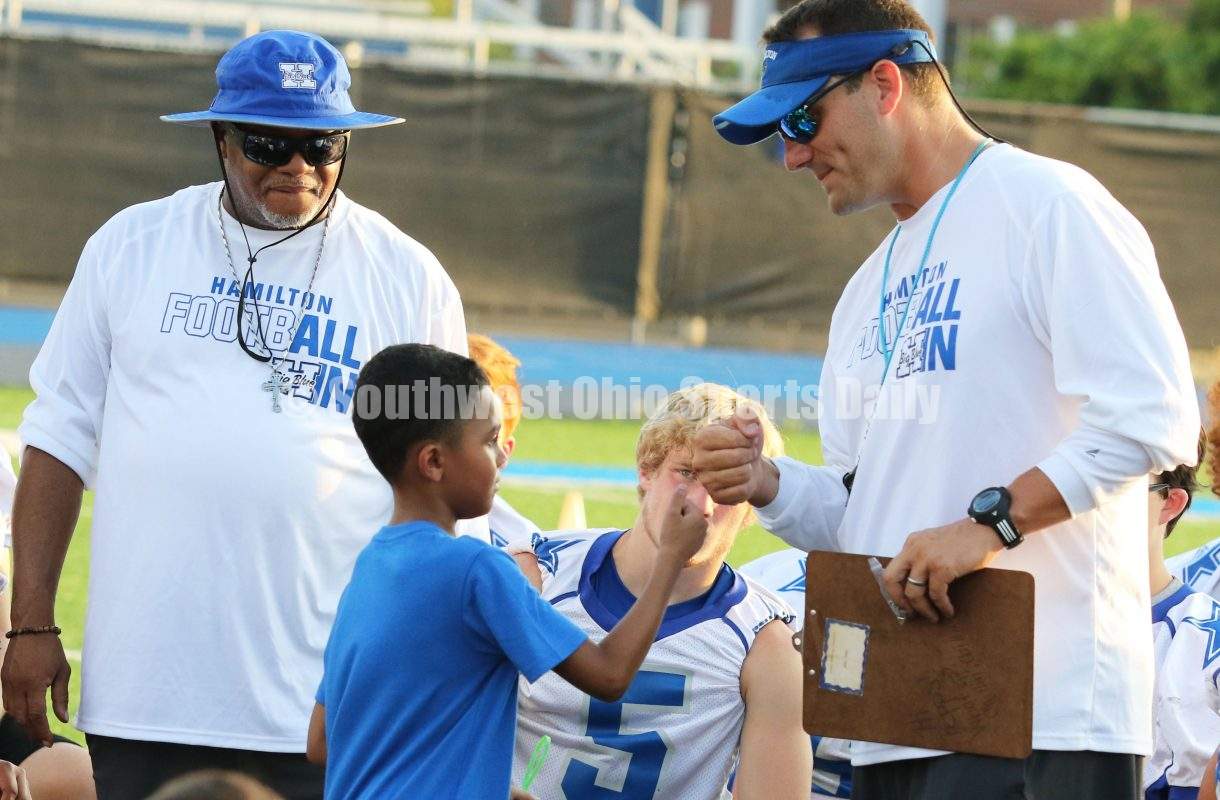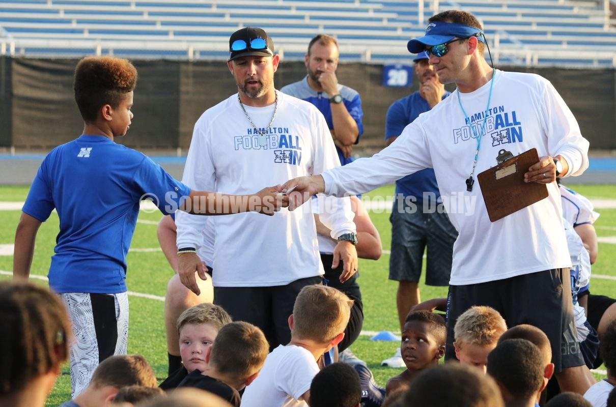 Hamilton High School had strong attendance for the first night of its youth football camp July 9, 2019, at Virgil Schwarm Stadium in Hamilton. RICK CASSANO/STAFF