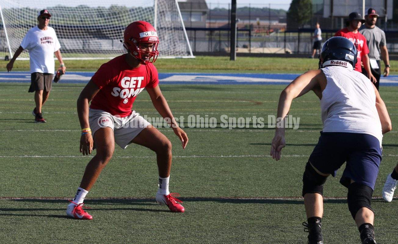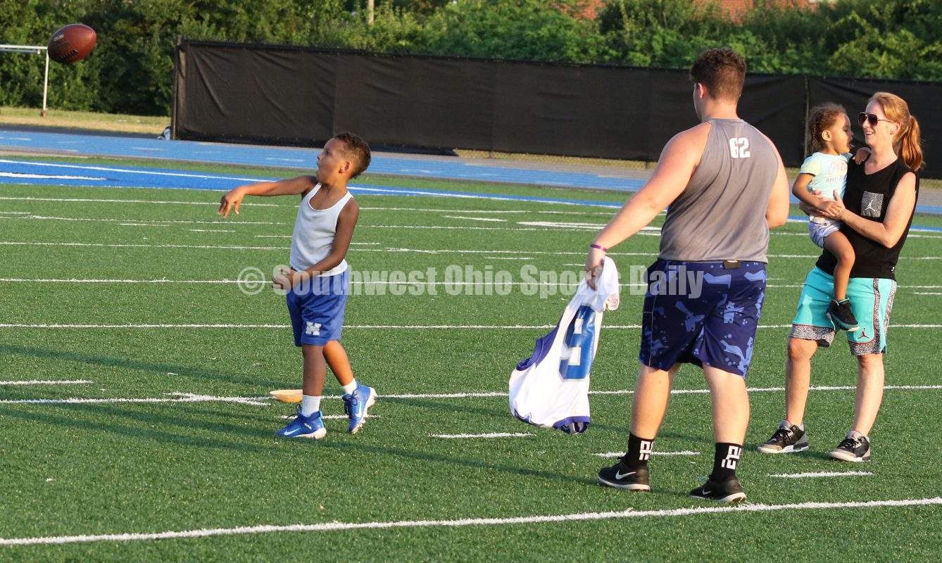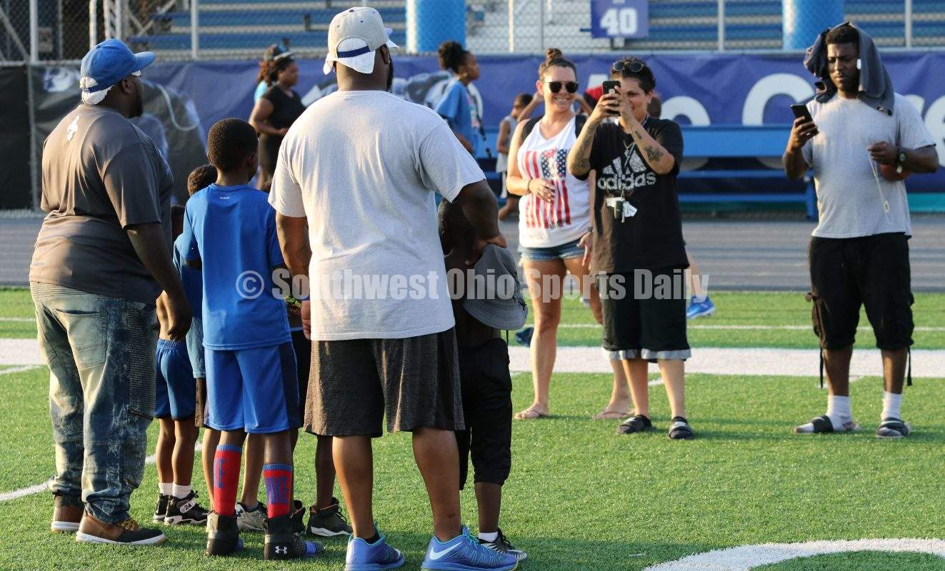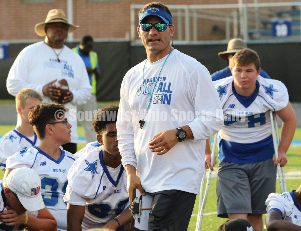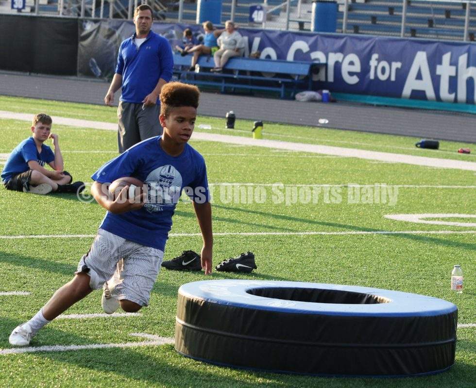 Hamilton High School had strong attendance for the first night of its youth football camp July 9, 2019, at Virgil Schwarm Stadium in Hamilton. RICK CASSANO/STAFF